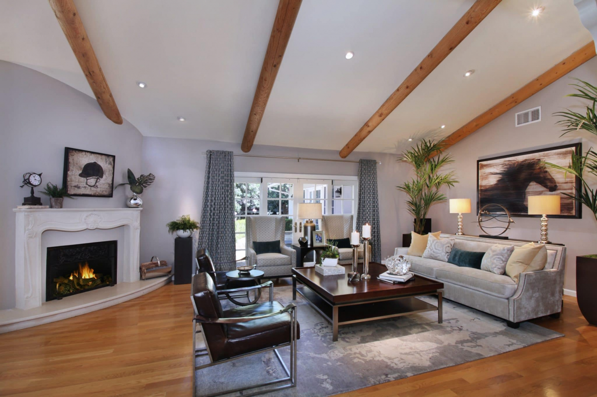 - С помощью натяжного потолка можно разбить гостиную на разные зоны